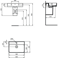 Umywalka IDEAL STANDARD STRADA II prostokątna (zaokrąglone krawędzie), biała, 600mm, bez otworu na baterię, nakładany od góry, bez odpływu przelewowego