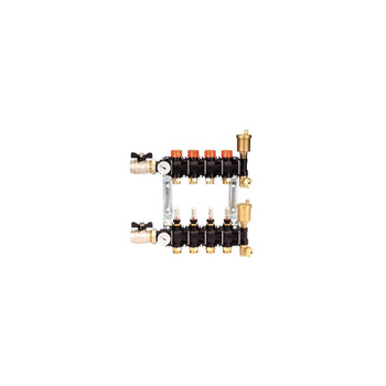 Modułowy rozdzielacz poliamidowy z przepływomierzem i wkładką zaworową (spust, napełnienie, regulacja, termometr, odpowietrzenie, zawory kulowe) 5 sekcji