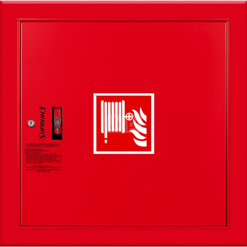 Hydrant DN 33 zawieszany boczny z miejscem na gaśnicę, wąż 30 m, ocynk fasada, zamek patent, RAL 3000 lewy