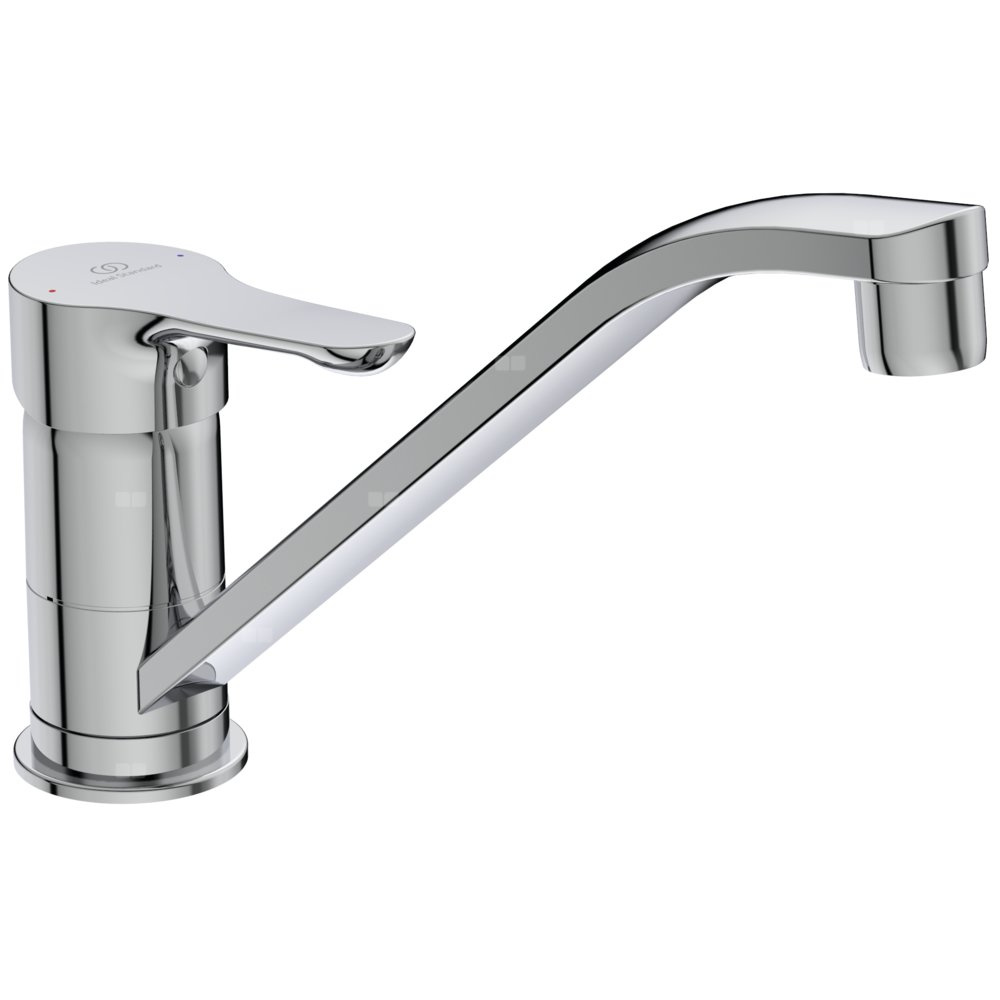 Bateria kuchenna z niską wylewką. Głowica ceramiczna 35 mm z ogranicznikiem temperatury. Metalowy uchwyt z nadrukowanymi czerwonymi i niebieskimi oznaczeniami. Technologia Click. Aerator (perlator). System montażu Easy-Fix. Wężyki przyłączeniowe G3/8”. Zgodność z normą EN 817.
