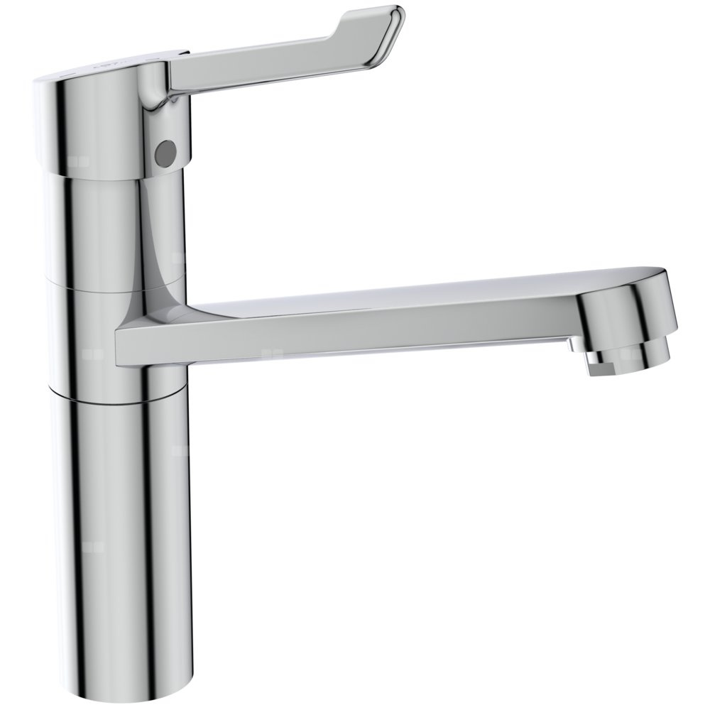 Ruchoma wylewka. Metalowy uchwyt medyczny dł. 130 mm. z nadrukowanymi czerwonymi i niebieskimi oznaczeniami. Technologia BlueStart® - uchwyt na wprost, przepływ wody wody zimnej. Aerator typu Perlator M24x1. Głowica 38 mm CLICK z funkcją ECO i ogranicznikiem temperatury wody. Wężyki przyłączeniowe G3/8”. System montażu EASY-FIX. *bateria przystosowana do wykorzystania w obiektach gastronomicznych i służby zdrowia.