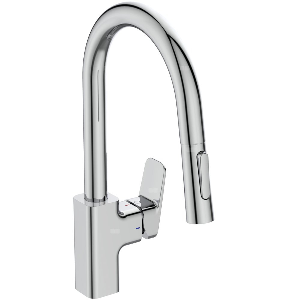 Jednootworowa, odlewany kwadratowy korpus, Ø47 mm, z obszarem Comfort R210 mm. Innowacyjna ceramiczna głowica FirmaFlow®, 38 mm, z funkcją. ograniczenia temperatury wody. Technologia Click. Technologia Blue Start®. Metalowy uchwyt. Metalowy uchwyt z oznaczeniem wody: ciepła/zimna. Mocowanie: uchwyt M33x1,5, nakrętka M33x1,5, dwie śruby M5. Wężyki przyłączeniowe G3/8”.