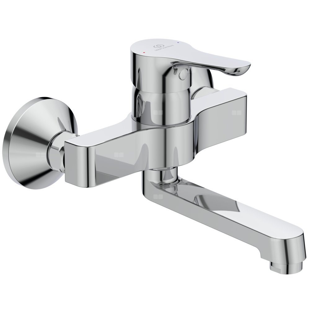 Bateria umywalkowa ścienna. Głowica ceramiczna 35 mm z ogranicznikiem temperatury. Metalowy uchwyt z nadrukowanymi czerwonymi i niebieskimi oznaczeniami. Aerator typu Perlator. Standardowe przyłącza mimośrodowe.