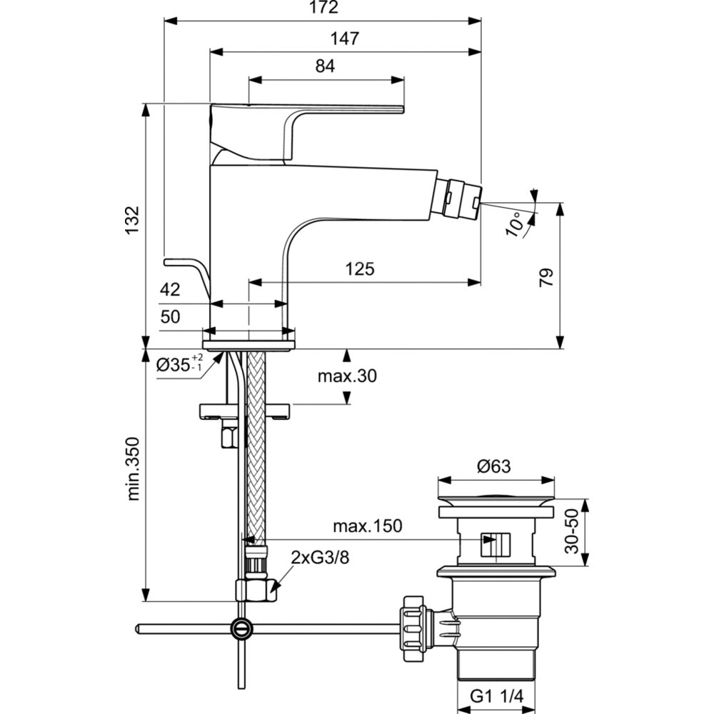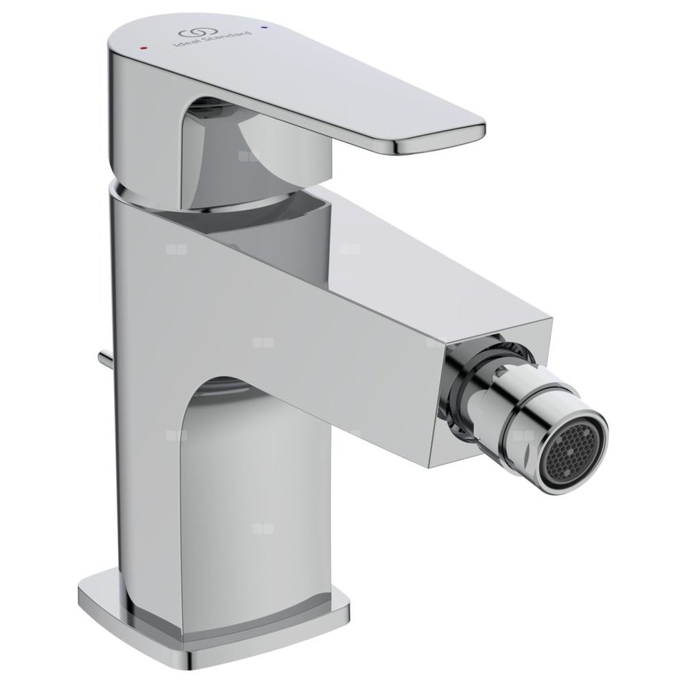Bateria bidetowa stojąca. Innowacyjna ceramiczna głowica FirmaFlow 28 mm z ogranicznikiem temperatury. Metalowy uchwyt z nadrukowanymi czerwonymi i niebieskimi oznaczeniami. Aerator z mocowaniem typu ball-joint (obrotowe), z ogranicznikiem. przepływu wody do 5 l/min. Ozdobna rozeta na podstawę korpusu (jedna sztuka). System montażu Easy-Fix. Wężyki przyłączeniowe G3/8”. Korek automatyczny z tworzywa. Zgodność z normą EN817.