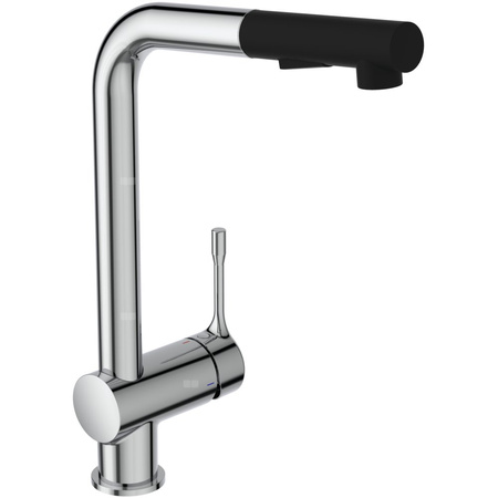 Bateria kuchenna stojąca BlueStart z wysoką wyciąganą wylewką. Wysoka ruchoma i wyciągana wielofunkcyjna wylewka typu L. Metalowy uchwyt z nadrukowanymi czerwonymi i niebieskimi oznaczeniami. Technologia Cold Start - przepływ wody zimnej wody. Ukryty aerator. Głowica FirmaFlow 38 mm, z ogranicznikiem temperatury. Technologia Click. Wężyki przyłączeniowe G3/8”. System montażu Easy-Fix. Zgodność z normą EN817.