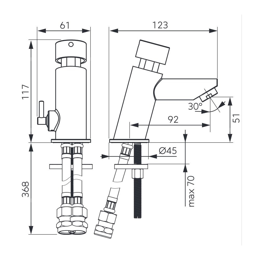 Bateria czasowa o uniwersalnym, cylindrycznym kształcie. Obły kształt korpusu i wylewki ułatwi utrzymanie baterii w czystości, krople wody nie będą osiadać, pozostawiając przy tym mniej osadu wapiennego. Bateria posiada funkcje regulacji czasu wypływu wody, co pomoże użytkownikowi zredukować zużycie wody a zarazem koszty wody i energii.
