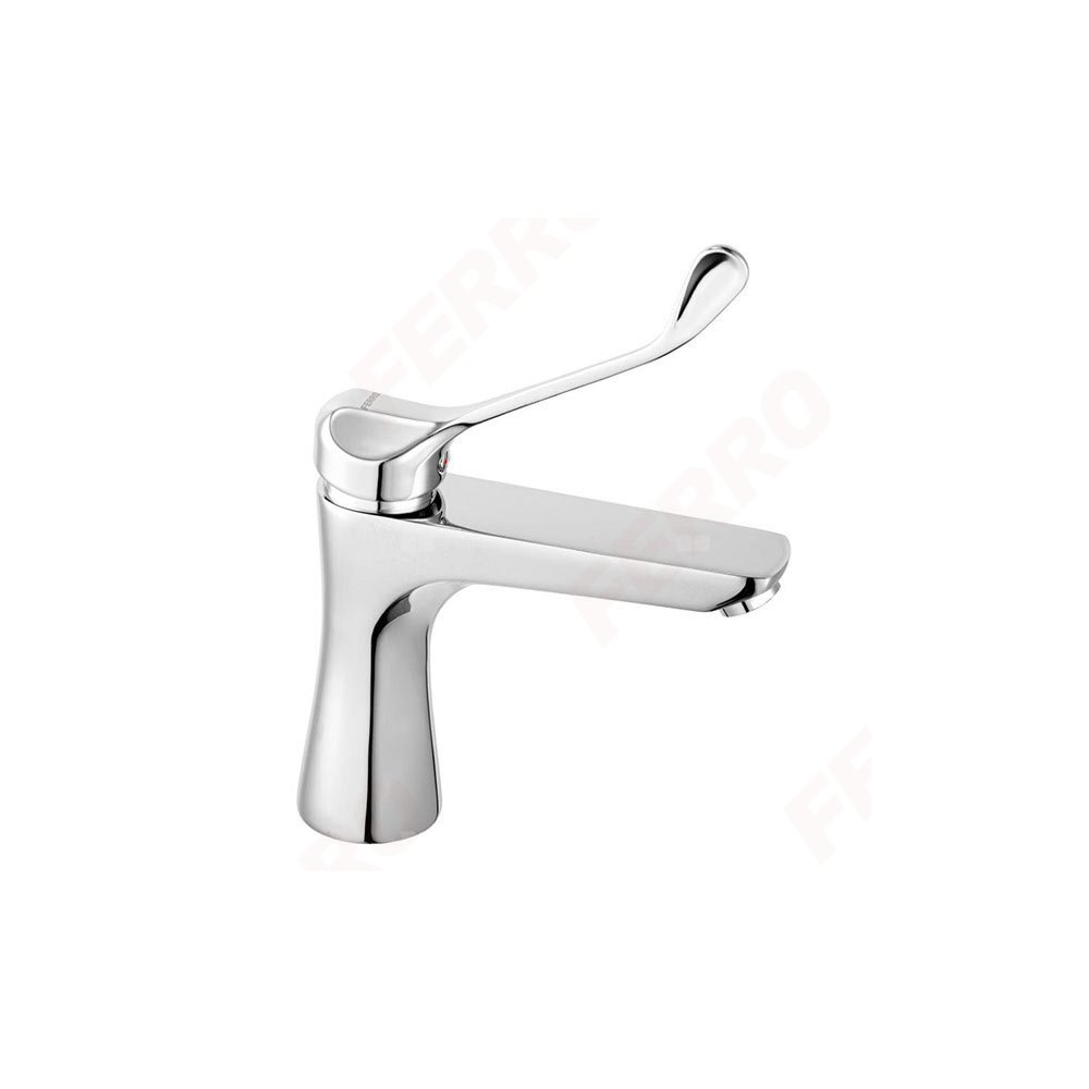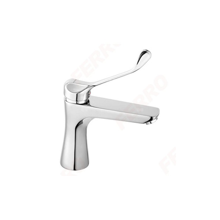 Bateria umywalkowa o delikatnym kształcie z prostokątnym uchwytem. Produkt posiada uchwyt medyczny z przedłużoną dźwignią, który ułatwia regulacje strumienia oraz temperatury wody.