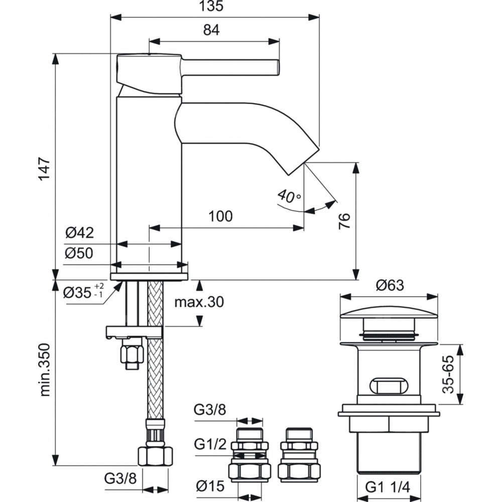 Głowica ceramiczna 28 mm z ogranicznikiem temperatury wody. Metalowy uchwyt z nadrukowanymi czerwonymi i niebieskimi oznaczeniami. Aerator ukryty Cache - z ogranicznikiem przepływu wody do 5l/min. Adapter do zmiany przepływ wodyu wody na laminarny (bez napowietrzenia). Automatyczny korek typu Click-Clack. Wężyki przyłączeniowe PEX G3/8".