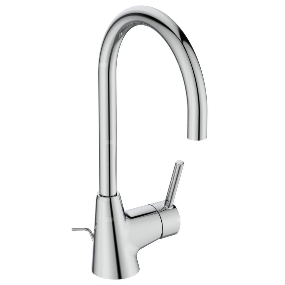 Bateria wysoka do umywalek nablatowych. Głowica ceramiczna 35 mm z ogranicznikiem temperatury wody. Metalowy uchwyt z nadrukowanymi czerwonymi i niebieskimi oznaczeniami. Wysoka wylewka R160. Aerator typu Perlator - z ogranicznikiem przepływu wody do 5l/min. Metalowy korek automatyczny. Wężyki przyłączeniowe PEX G3/8".