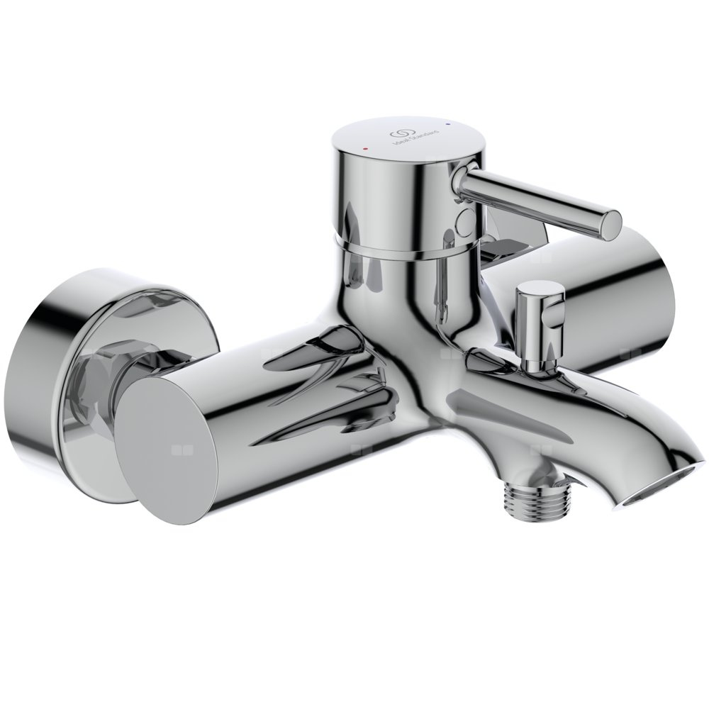 Bateria wannowa ścienna. Innowacyjna ceramiczna głowica FirmaFlow 38 mm, z ogranicznikiem temperatury. Metalowy uchwyt z nadrukowanymi czerwonymi i niebieskimi oznaczeniami. Zawór zwrotny. Przyłącza mimośrodowe z redukcją hałasu. Aerator typu Cache. Przełącznik automatyczny wanna/natrysk.