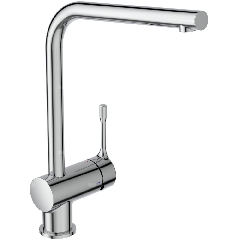 Bateria kuchenna stojąca BlueStart z wysoką wylewką. Wysoka ruchoma wylewka typu L. Metalowy uchwyt z nadrukowanymi czerwonymi i niebieskimi oznaczeniami. Technologia Cold Start - przepływ wody zimnej wody. Ukryty aerator. Głowica FirmaFlow 38 mm, z ogranicznikiem temperatury. Technologia Click. Wężyki przyłączeniowe G3/8”. System montażu Easy-Fix .