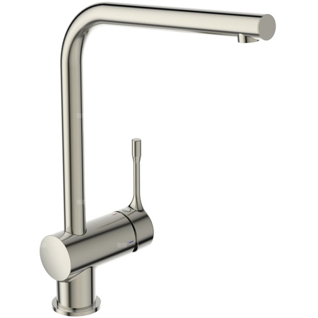 Bateria kuchenna stojąca BlueStart z wysoką wylewką. Wysoka ruchoma wylewka typu L. Metalowy uchwyt z nadrukowanymi czerwonymi i niebieskimi oznaczeniami. Technologia Cold Start - przepływ wody zimnej wody. Ukryty aerator. Głowica FirmaFlow 38 mm, z ogranicznikiem temperatury. Technologia Click. Wężyki przyłączeniowe G3/8”. System montażu Easy-Fix.