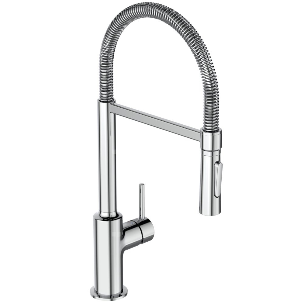 Bateria kuchenna stojąca typu SEMI PRO. Wysoka, elastyczna 2-funkcyjna wylewka z ramieniem stabilizującym. Metalowy uchwyt z nadrukowanymi czerwonymi i niebieskimi oznaczeniami. Ukryty aerator. Głowica ceramiczna 35 mm. Wężyki przyłączeniowe G3/8”. System montażu Easy-Fix. W kompaktowym pudełku.