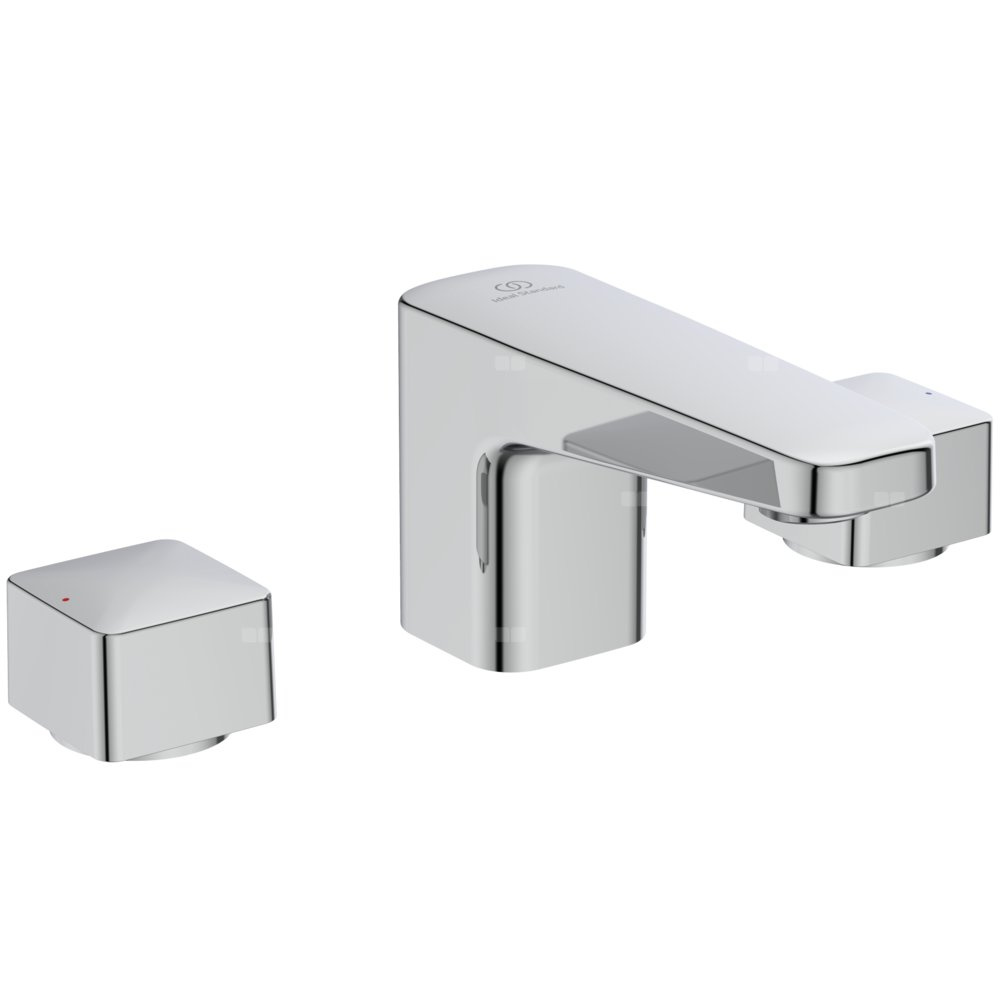 Dwuchwytowa, trzyotworowa. Głowice ceramiczne 90°: Włącz/Wyłącz. Metalowy uchwyt z oznaczeniem wody: ciepła/zimna. Wylewka o długości 105 mm. Aerator z ogranicznikiem przepływu wody do 5 l/min. Metalowy korek automatyczny.