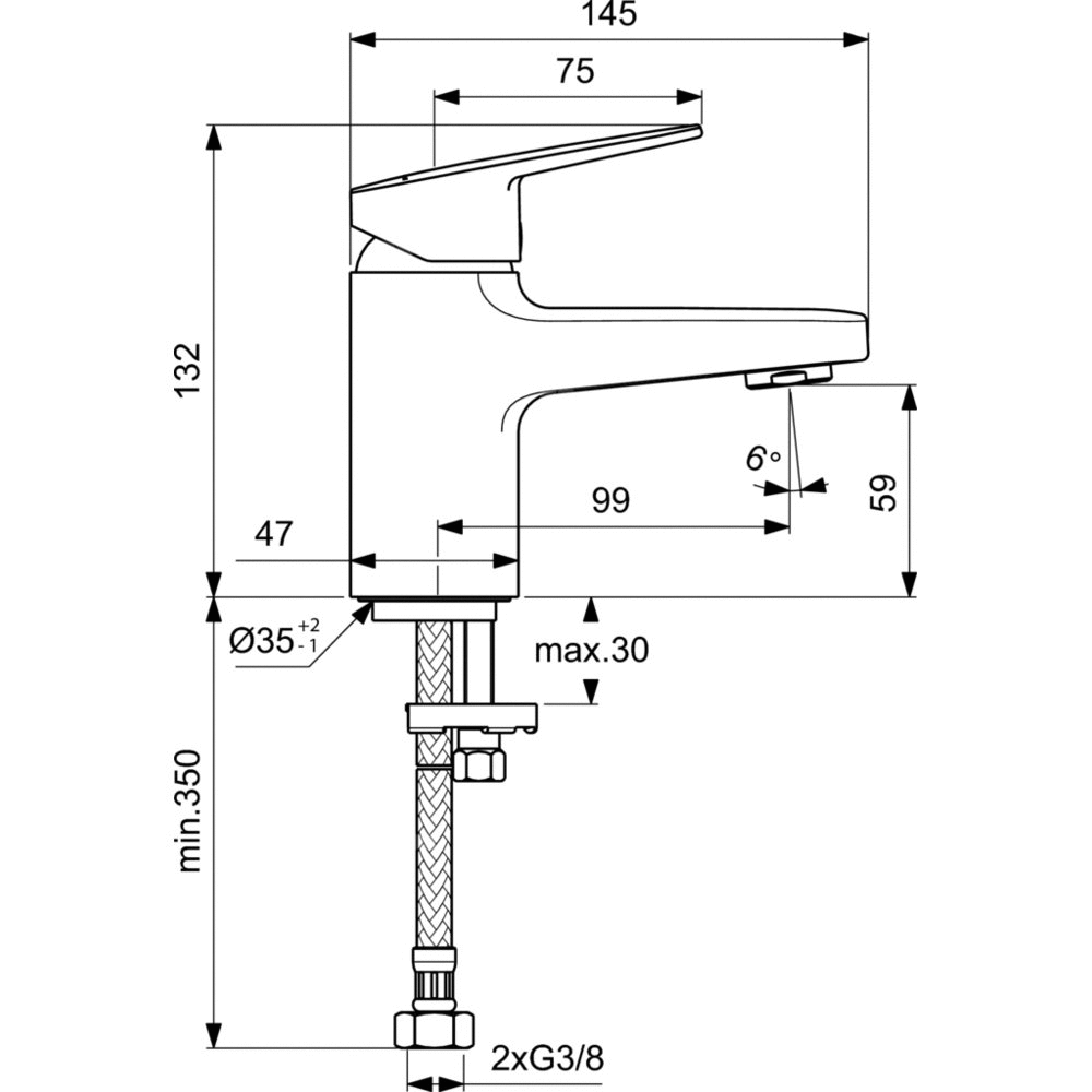 Bateria umywalkowa stojąca. Jednootworowa z obszarem Comfort pod aeratorem: 60 mm. Innowacyjna ceramiczna głowica FirmaFlow 38 mm z ogranicznikiem temperatury. Metalowy uchwyt z nadrukowanymi czerwonymi i niebieskimi oznaczeniami. Smukły aerator z ogranicznikiem przepływu wody do 5 l/min. System montażu Easy-Fix. Wężyki przyłączeniowe G3/8”.