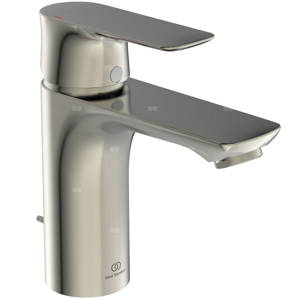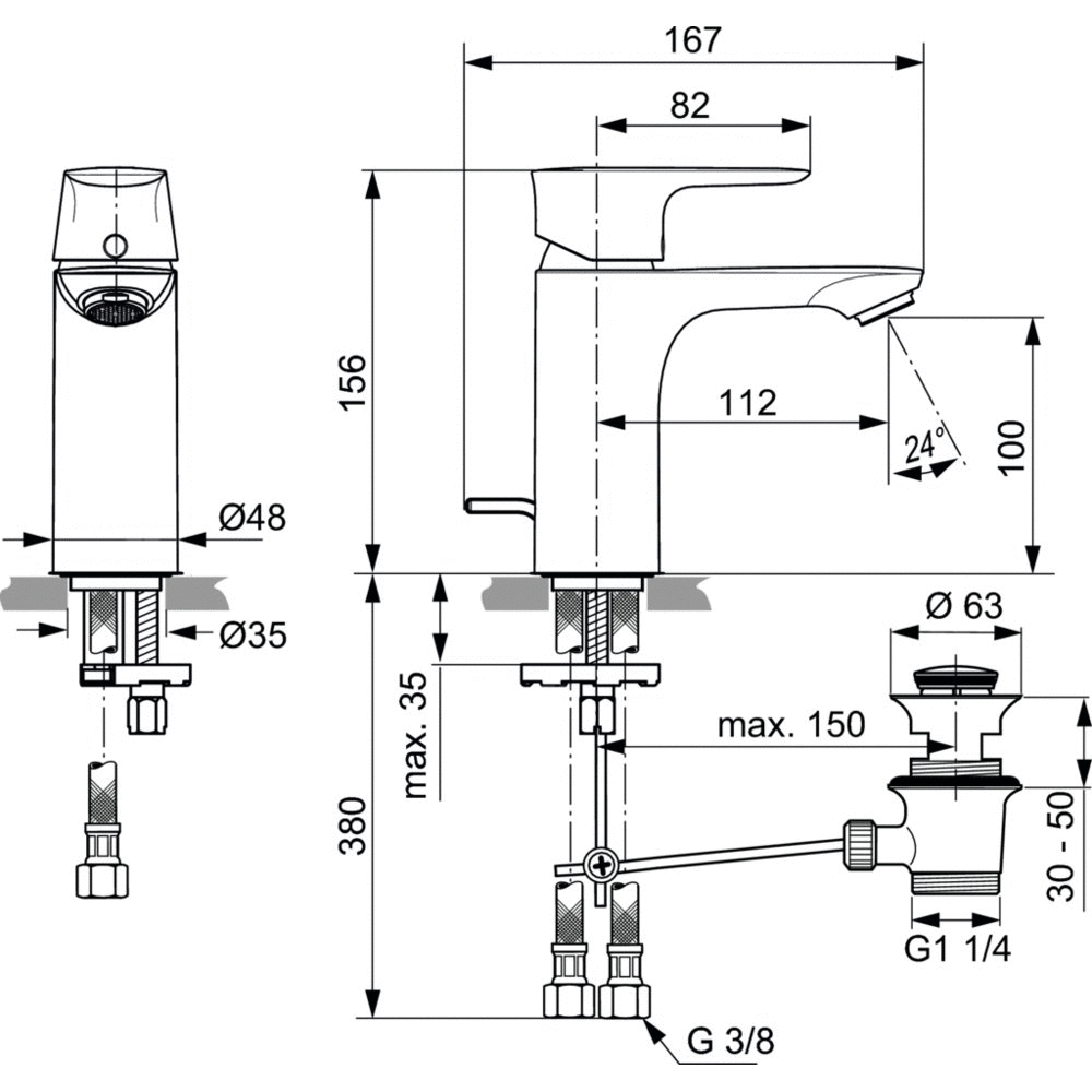 Bateria umywalkowa z metalowym korkiem automatycznym. Mosiężny, odlewany korpus 48 mm. Metalowy uchwyt z nadrukowanymi czerwonymi i niebieskimi oznaczeniami, mocowanie uchwytu przedniego, chromowany przycisk. Aerator typu Perlator M24x1 - 5l/min, głowica FirmaFlow 28 mm bez ogranicznika temperatury. Brak funkcji Click. Wężyki przyłączeniowe PEX G3/8".