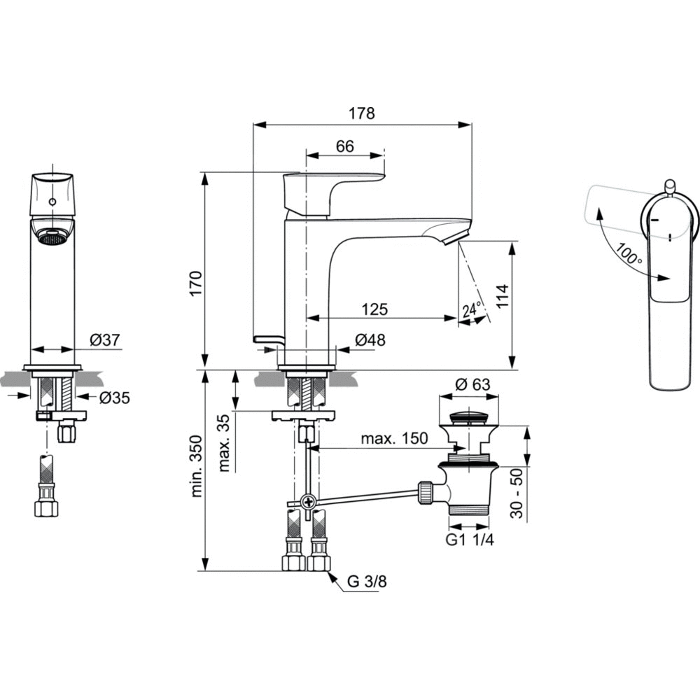Jednootworowa bateria umywalkowa Grande z metalowym automatycznym korkiem. Smukły metalowy wyższy korpus typu Grande 37 mm i dłuższa wylewka. Technologia Blue Start. Metalowy uchwyt z nadrukowanymi czerwonymi i niebieskimi oznaczeniami. Aerator typu Perlator M24x1 - 5l/min, głowica 25 mm. Technologia Cold Start - wypływ zimnej wody. Wężyki przyłączeniowe PEX G3/8".