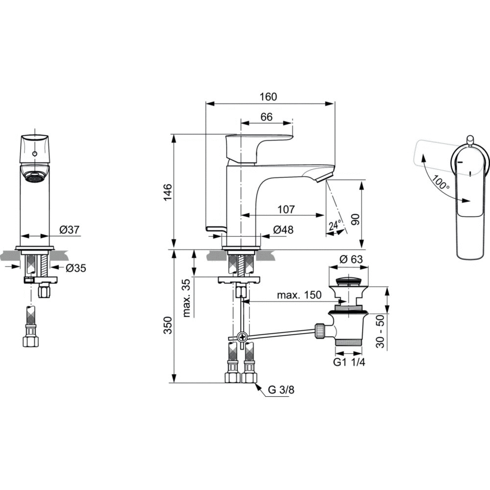Bateria umywalkowa z metalowym automatycznym korkiem. Smukły metalowy korpus 37 mm. Aerator typu Perlator M24x1. Głowica ceramiczna 28 mm. Metalowy uchwyt z nadrukowanymi czerwonymi i niebieskimi oznaczeniami. Technologia Cold Start - wypływ zimnej wody. Elastyczne wężyki przyłączeniowe PEX G3/8".
