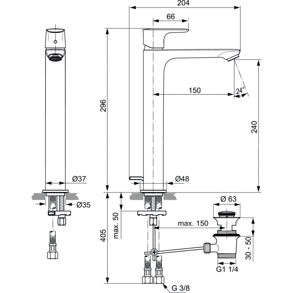 Bateria umywalkowa nablatowa jednootworowa z metalowym korkiem automatycznym. Smukły metalowy korpus, wysoka bateria do umywalek nablatowych. Metalowy uchwyt z nadrukowanymi czerwonymi i niebieskimi oznaczeniami. Aerator typu Perlator M24x1 - 5l/min, głowica 25 mm bez ogranicznika temperatury. Wężyki przyłączeniowe PEX G3/8".