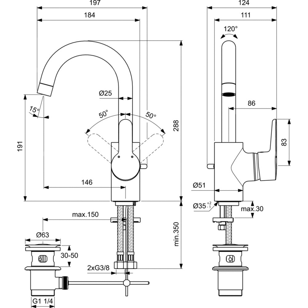 Bateria umywalkowa, paraboliczna wylewka z korkiem automatycznym. Głowica 40 mm CLICK z funkcją ECO i ograniczeniem temperatury wody. Wężyki przyłączeniowe typu SPX G3/8". Paraboliczna wylewka R145 mm 120˚. Areator typu Cascade M24x1. Metalowy uchwyt z nadrukowanymi czerwonymi i niebieskimi oznaczeniami. Metalowy korek automatyczny. System montażu EASY-FIX.