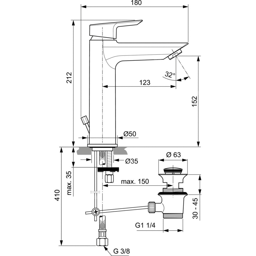 Tesi bateria umywalkowa Grande jednootworowa z metalowym automatycznym korkiem. Głowica ceramiczna IS 28 mm z ogranicznikiem temperatury. Mosiężny, odlewany korpus. Metalowy uchwyt z nadrukowanymi czerwonymi i niebieskimi oznaczeniami. Perlator Cascade. Wężyki przyłączeniowe G3/8".
