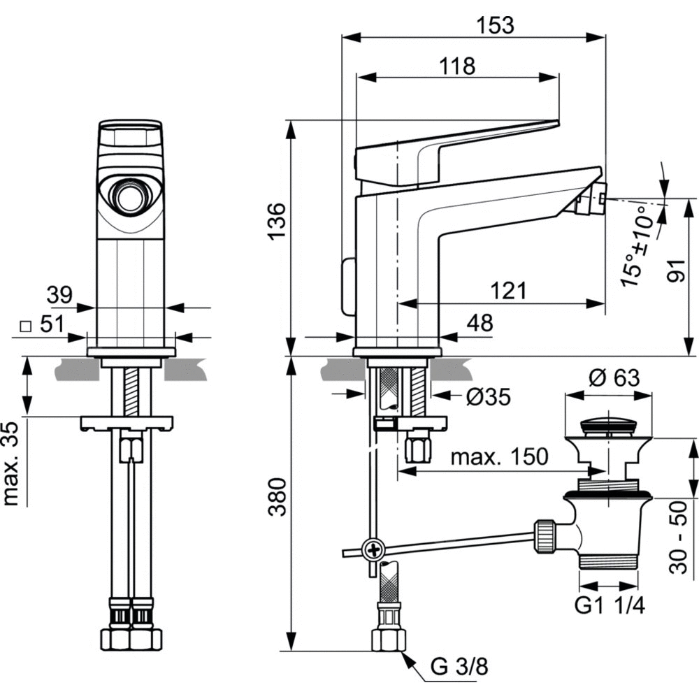 Bateria bidetowa jednootworowa. Głowica ceramiczna IS 28 mm z ogranicznikiem temperatury. Mosiężny, odlewany korpus. Metalowy uchwyt z nadrukowanymi czerwonymi i niebieskimi oznaczeniami, metalowy automatyczny korek. Perlator typu Ball Joint M18x1 z regulacją kierunku strumienia. Elastyczne węże G3/8”.