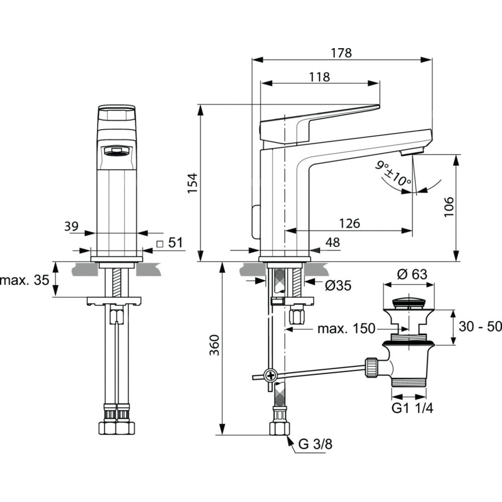 Jednootworowa bateria umywalkowa z głowicą ceramiczną 28 mm i ogranicznikiem temperatury. Mosiężny, odlewany korpus. Metalowy uchwyt z nadrukowanymi czerwonymi i niebieskimi oznaczeniami oraz metalowy automatyczny korek. Perlator typu Cascade z ogranicznikiem przepływu wody do 5 l/min i regulacją kierunku strumienia. Elastyczne węże przyłączeniowe z gwintem G3/8". System montażu EASY-FIX. Metalowy pierścień.
