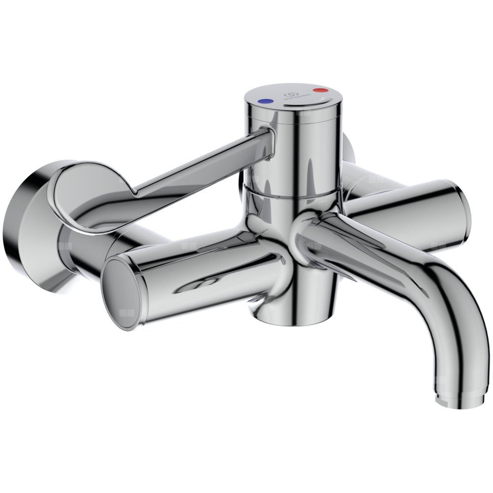 Bateria termostatyczna umywalkowa ścienna. Funkcja Cool Body, zapobiegająca ryzyku poparzenia przez nagrzany korpus baterii. Odlewany korpus z wylewką zapewniającą samoczynny odpływ wody. Metalowy uchwyt medyczny dł. 120 mm z nadrukowanymi czerwonymi i niebieskimi oznaczeniami. Wandaloodporny perlator ograniczający napowietrzenie strumienia wody. Termostatyczna głowica sekwencyjna (Cycle Valve) z ogranicznikiem temperatury. Funcja dezynfekcji termicznej. Bateria z zaworami zwrotnymi. Ukryte przyłącza mimośrodowe baterii. Klasa akustyczna 1. Zgodna z EN817.