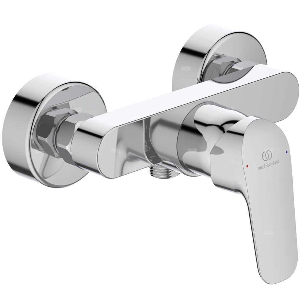 Bateria natryskowa ścienna. Głowica ceramiczna 40 mm z ogranicznikiem temperatury. Odlewany korpus z mosiądzu. Metalowy uchwyt oraz rozeta z nadrukowanymi czerwonymi i niebieskimi oznaczeniami. Zawór zwrotny. Przyłącza mimośrodowe.