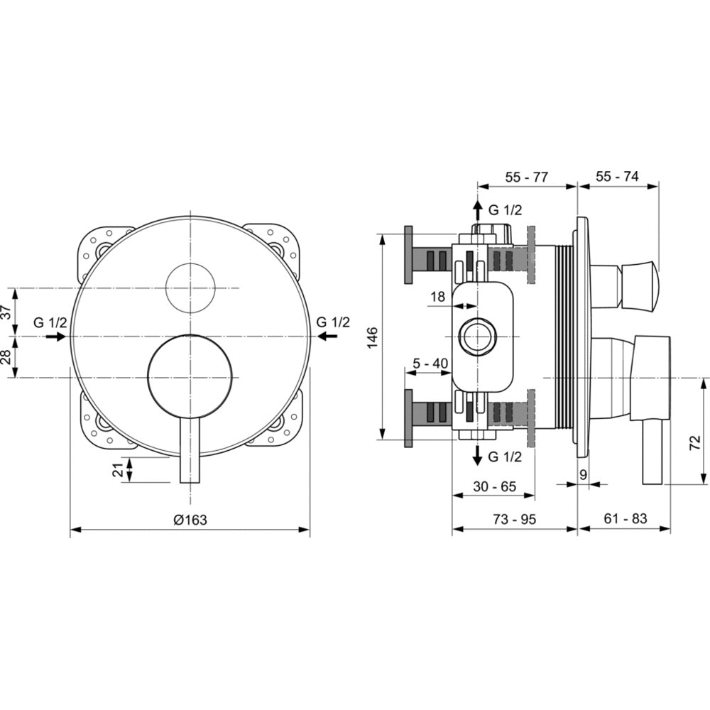 Zestaw montażowy baterii podtynkowej wannowo-natryskowej Ceraline. Głowica ceramiczna IS 47 mm CLICK. Metalowy uchwyt z nadrukowanymi czerwonymi i niebieskimi oznaczeniami. Okrągła rozeta. Automatyczny przełącznik. Do skompletowania z uniwersalnym zestawem podtynkowym EASY-BOX A1000NU.