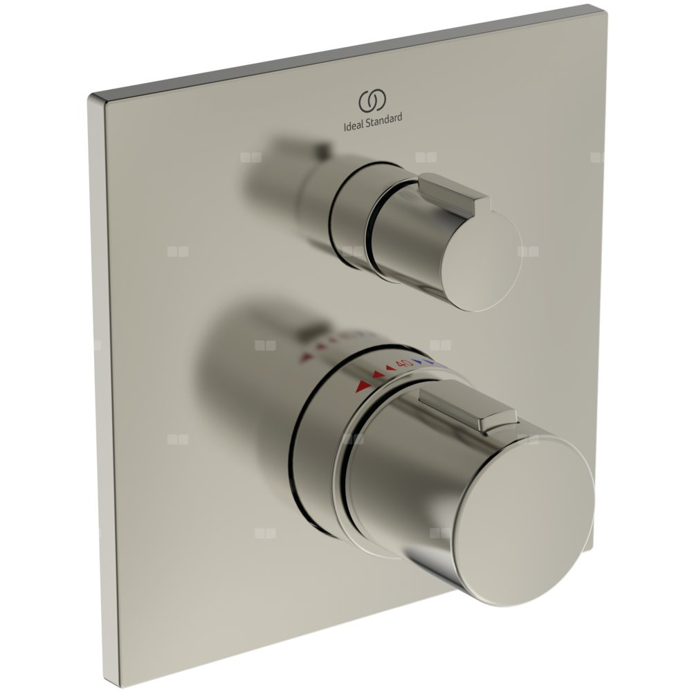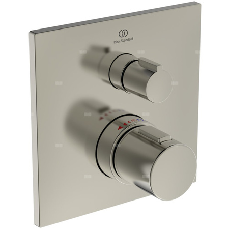 Zestaw montażowy podtynkowej baterii termostatycznej natryskowej (część zewnętrzna). Głowica termostatyczna IS. Ceramiczny zawór talerzowy 3/4'' włącz/wyłącz 90°. Bez przełącznika oraz akcesoriów. Uchwyt z przyciskiem ograniczającym temperaturę wody do 40°C. Metalowa chromowana rozeta o wymiarach 163 mm x 163 mm x 10,5 mm, dodatkowo uszczelniona. Maksymalny przepływ wody przy ciśnieniu 3 bar - 26 l/min. Do skompletowania z elementem montażowym: A1000NU.