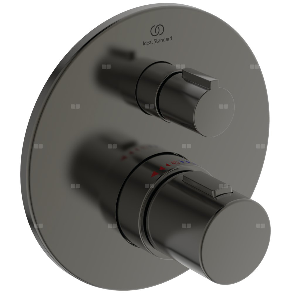 Zestaw montażowy baterii termostatycznej natryskowej podtynkowej (część zewnętrzna). Z głowicą termostatycznną IS (nowa technologia). Ceramiczny zawór talerzowy włącz/wyłącz 90° i przyłączem gwint 3/4''. Bez zintegrowanego przełącznika. Bez akcesoriów w komplecie. Niezbędne wyposażenie: zestaw montażowy A1000NU (część wewnętrzna).