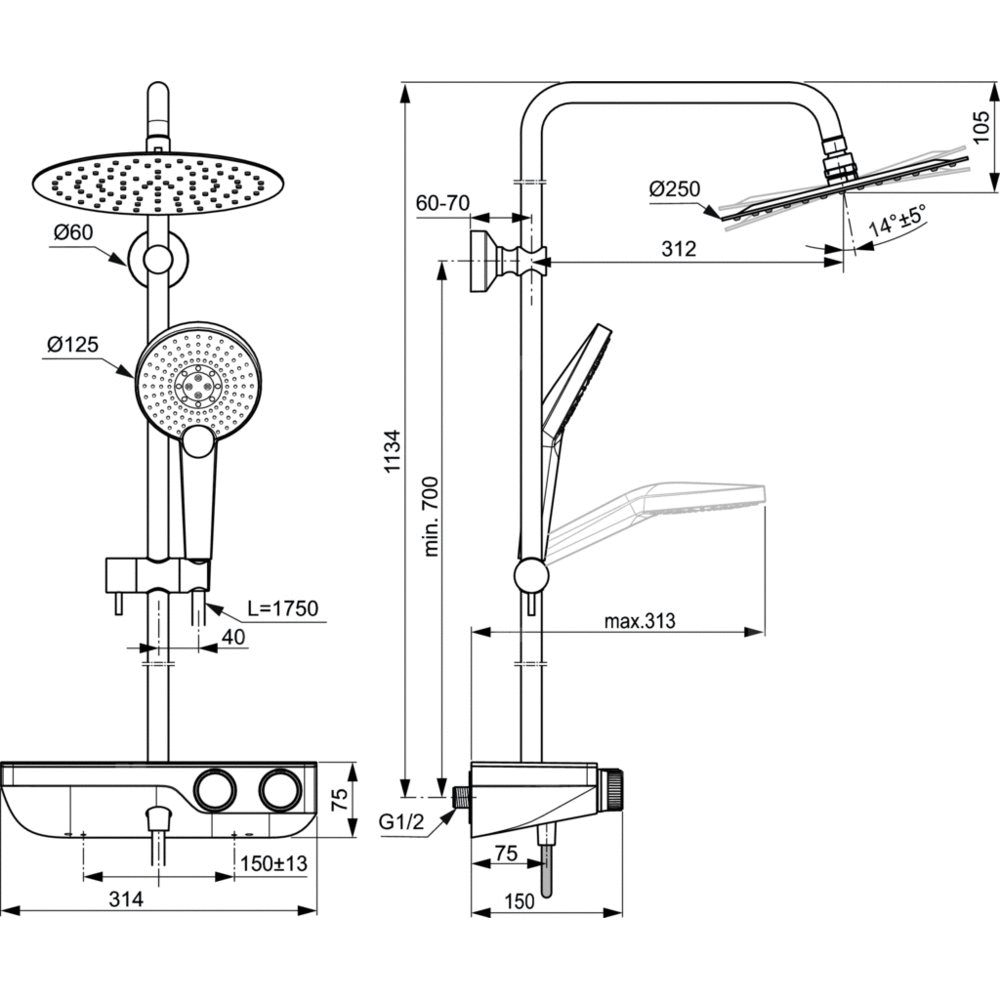 Ukryte przyłącza mimośrodowe, zintegrowane z korpusem baterii. Głowica termostatyczna IS nowej technologii. Regulacja temperatury termostatu przez pokrętło. Uchwyt z ogranicznikiem temperatury do 40°C. Regulacja mocy przepływu przez pokrętło, głowica ceramiczna G1/2’’ 90°. Przełącznik deszczownica/słuchawka zintegrowany w w pokrętle regulacji przepływu. Funcja ECO redukcjąca przepływ wody wody o 50%. Łatwe użytkowanie dzięki pokrętłom umiejscowionym od frontu. Półka wykonana z bezpiecznego szkła w kolorze białym. Przyłącze natryskowe G1/2". Zintegrowane zawory zwrotne w przyłączach baterii. Funkcja Cool body zapobiegająca poparzeniu przez korpus baterii. Metalowa deszczownica średnicy 250 mm z ogranicznikiem przepływu wody do 12 l/min. Słuchawka prysznicowa Idealrain Evo Jet średnicy 125 mm, z ogranicznikiem przepływu wody do 8 l/min. Wykonane z metalu przesuwne mocowanie słuchawki. Mocowania ścienne do szybkiego montażu z regulacja pionowa dającą możliwość instalacji w istniejących otworach ściennych. Regulowany kąt ustawienia deszczownicy.