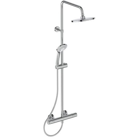 System natryskowy Ceratherm T25. Standardowe przyłącza mimośrodowe. Głowica termostatyczna IS nowej technologii. Ceramiczny zawór G1/2 180°. Uchwyt z ogranicznikiem temperatury do 40°C i przyciskiem redukującym przepływ wody o 50%. Zawór zwrotny. W komplecie system natryskowy: deszczownica z tworzywa sztucznego Ø200 mm, z ogranicznikiem przepływu 12 l/min oraz słuchawka natryskowa 100 mm 3-funkcyjna Idealrain z poziomą regulacją punktów mocowania do ściany i wąż natryskowy 1600 mm Idealflex. Zalecane dodatkowe elementy: przedłużenie do drążka natryskowego, 150 mm A861379AA lub przedłużenie do drążka natryskowego, 300 mm A861380AA.
