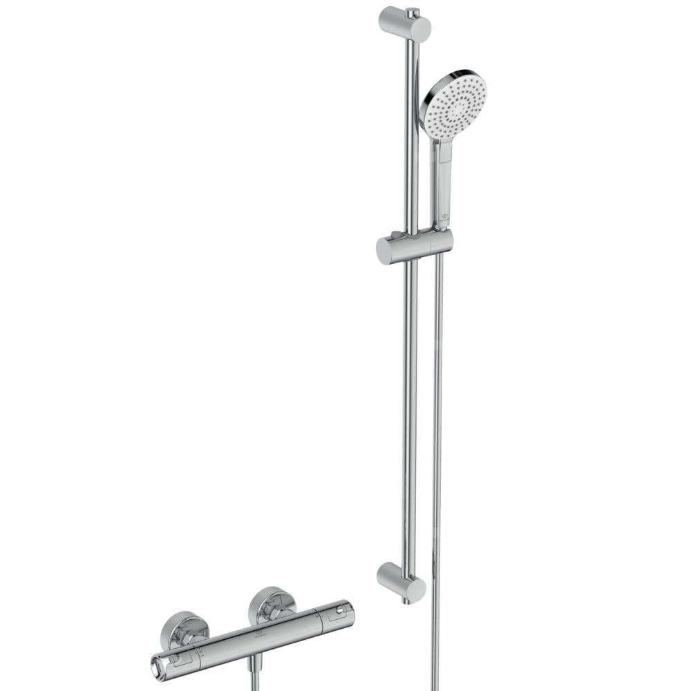 System natryskowy Ceratherm T50 natynkowy z akcesoriami. Standardowe przyłącza mimośrodowe. Głowica termostatyczna IS nowej technologii. Ceramiczny zawór G1/2 180°. Uchwyt z ogranicznikiem temperatury do 40°C i przyciskiem redukującym przepływ wody o 50%. Zawór zwrotny. W komplecie system natryskowy: słuchawka natryskowa 110 mm 3-funkcyjna Idealrain Evo Round, z ogranicznikiem przepływu 8l/min oraz wąż natryskowy 1750 mm Idealflex i drążek natryskowy 600 mm z regulacją punktów mocowania do ściany. Zalecane dodatkowe elementy: nakładana półka do baterii termostatycznych Ceratherm T25, T50 i T100 A7215AA.