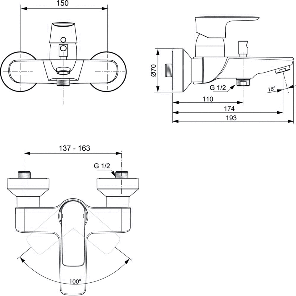 Bateria wannowo-natryskowa ścienna. Głowica ceramiczna 38 mm FirmaFlow z ogranicznikiem temperatury HWTC. Brak funkcji Click, przełącznik automatyczny. Mosiężny, odlewany korpus. Metalowy uchwyt z nadrukowanymi czerwonymi i niebieskimi oznaczeniami. Standardowe przyłącza ścienne S-Connection z redukcją hałasu. Perlator typu Cascade z regulacją kierunku strumienia. Zawór zwrotny, osłona śrub przyłączeniowych.