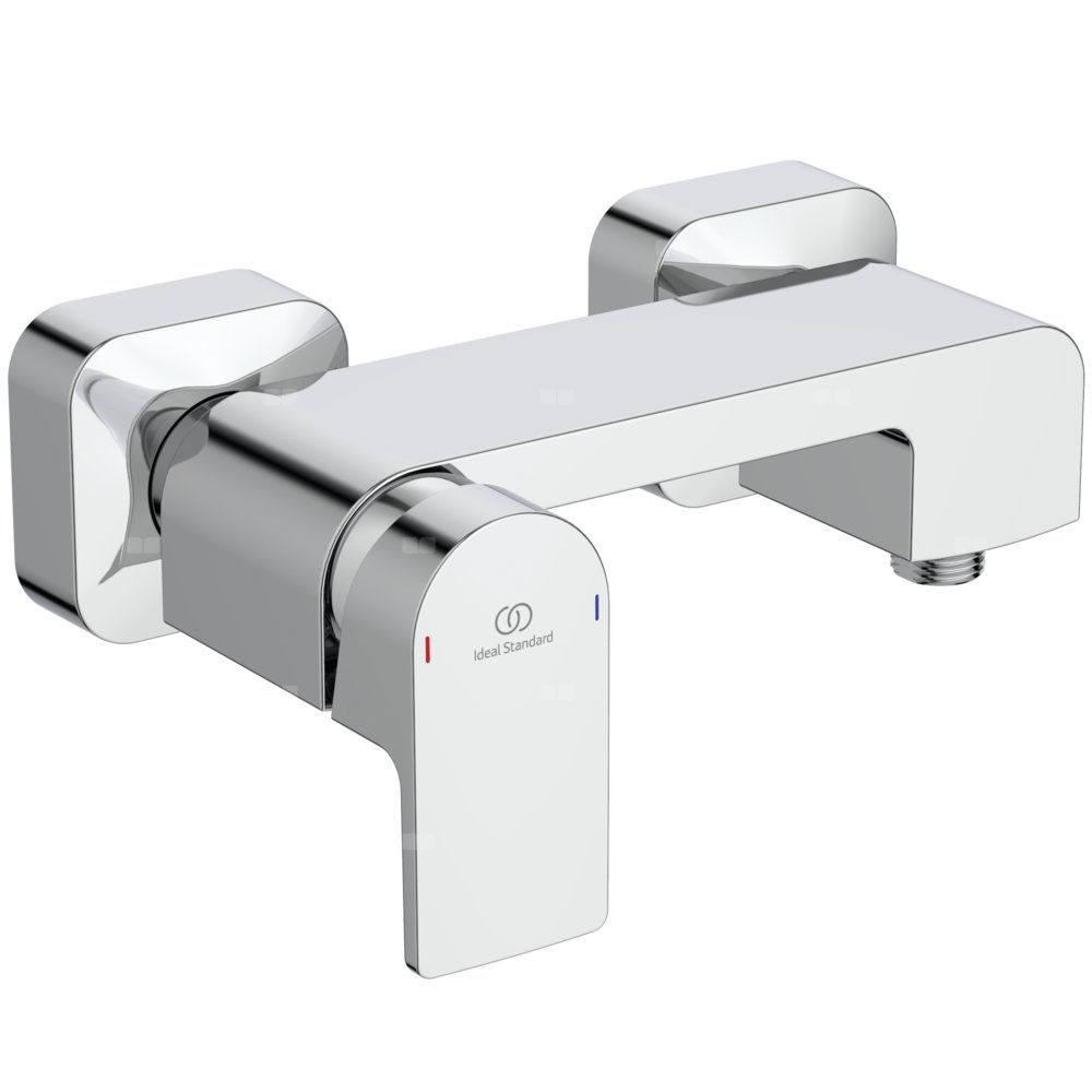 Bateria natryskowa ścienna. Głowica FirmaFlow ISI 38 mm z ogranicznikiem temperatury. Smukły, mosiężny, odlewany korpus. Metalowy uchwyt z logo Ideal Standard oraz nadrukowanymi czerwonymi i niebieskimi oznaczeniami. Zawór zwrotny. Osłona śrub przyłączeniowych, ukryte przyłącza mimośrodowe baterii. Klasa akustyczna 1. Zgodna z EN817.