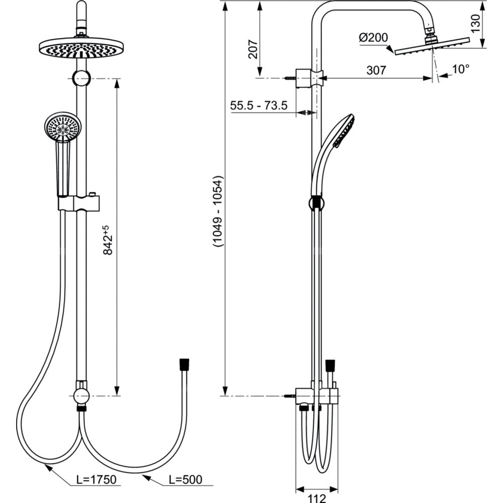System natryskowy bez mocowania. Dwudrożny, zintegrowany ceramiczny przełącznik: słuchawka/deszczownica. Regulowany, solidny uchwyt ścienny, 2ygięte ramię mocowane do uchwytu ściennego. Trzyfunkcyjna słuchawka prysznicowa z tworzywa: 80 mm, z ogranicznikiem przepływu wody do 8 l/min. Deszczownica z tworzywa: 200mm, z ogranicznikiem przepływu wody do 9,5 l/min. Drążek przepływowy, 1051 mm, Ø 25 mm z uchwytem. IdealFlex 1750 mm gładki wąż natryskowy z zabezpieczeniem przeciwskrętnym, 0,5 m (do podłączenia systemu).