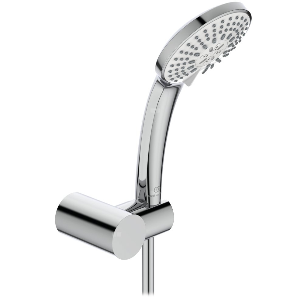 Gumowe końcówki dysz zapobiegające osadzaniu się kamienia. Słuchawka prysznicowa, Ø 100 mm z ogranicznikiem przepływu. wody do 8 l/min. Trójfunkcyjna. Metalowy wąż natryskowy, 1250 mm. Ruchomy uchwyt ścienny. Logo Ideal Standard.