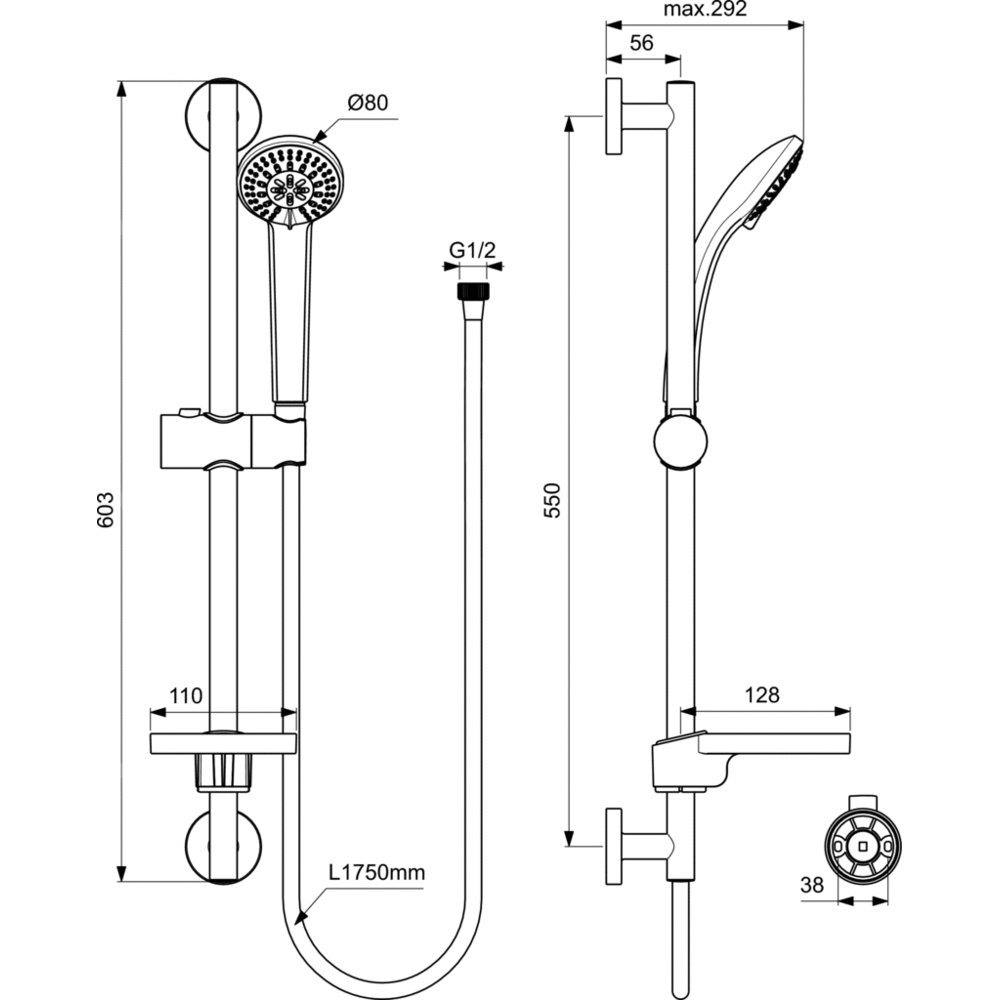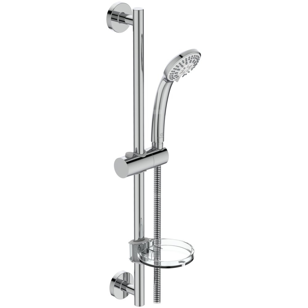 Idealrain zestaw natryskowy S3 drążek 600 mm. Jednofunkcyjna słuchawka prysznicowa średnicy 80 mm. Drążek o długości 600 mm z przeźroczystą mydelniczką. Metalowy wąż długości 1750 mm. Wykonane z tworzywa mocowanie przesuwne słuchawki.