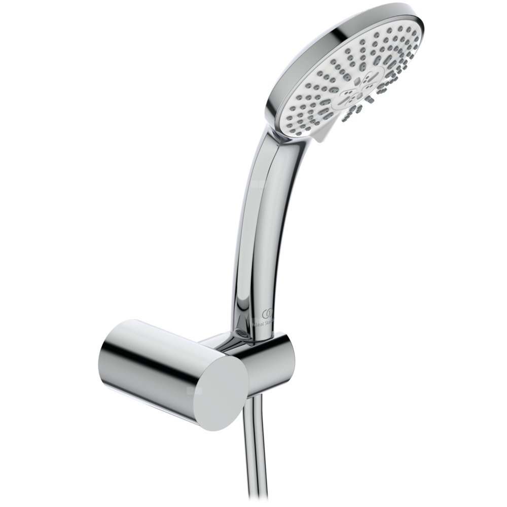 Gumowe końcówki dysz zapobiegające osadzaniu się kamienia. Słuchawka prysznicowa, Ø 100 mm z ogranicznikiem przepływu. wody do 8 l/min. Trójfunkcyjna. Metalowy wąż natryskowy, 1750 mm. Ruchomy uchwyt ścienny. Logo Ideal Standard.