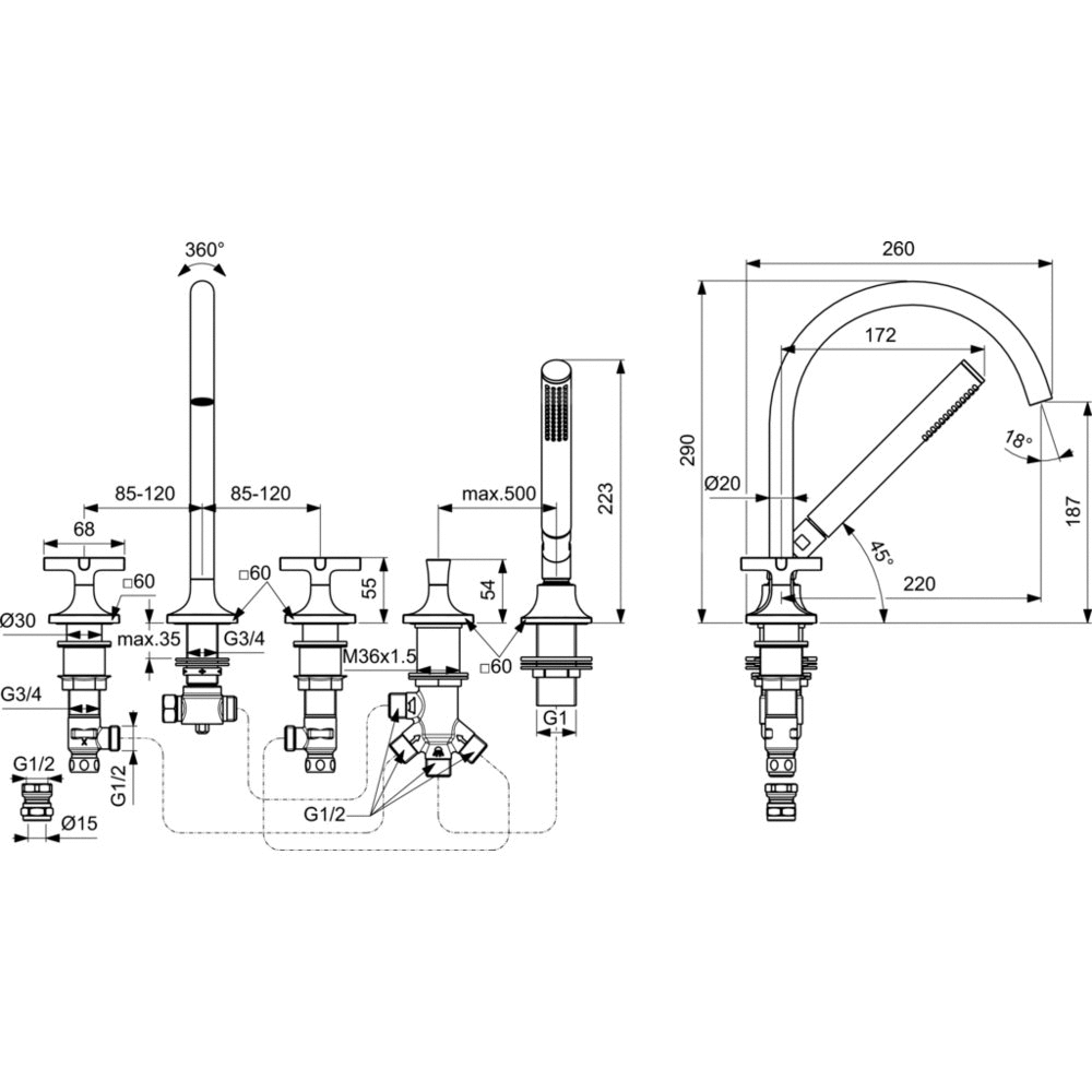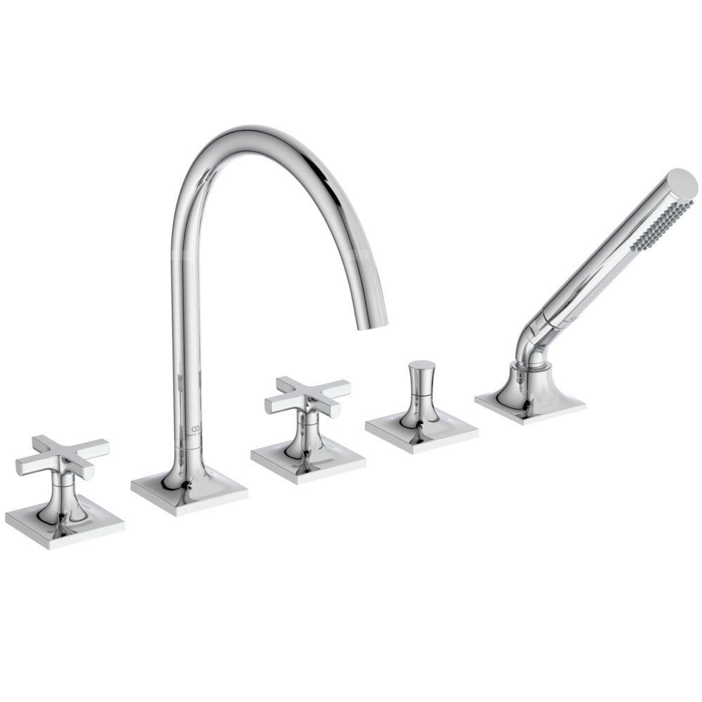 Bateria natryskowo-wannowa 4-otworowa, wylewka, uchwyty krzyżowe.