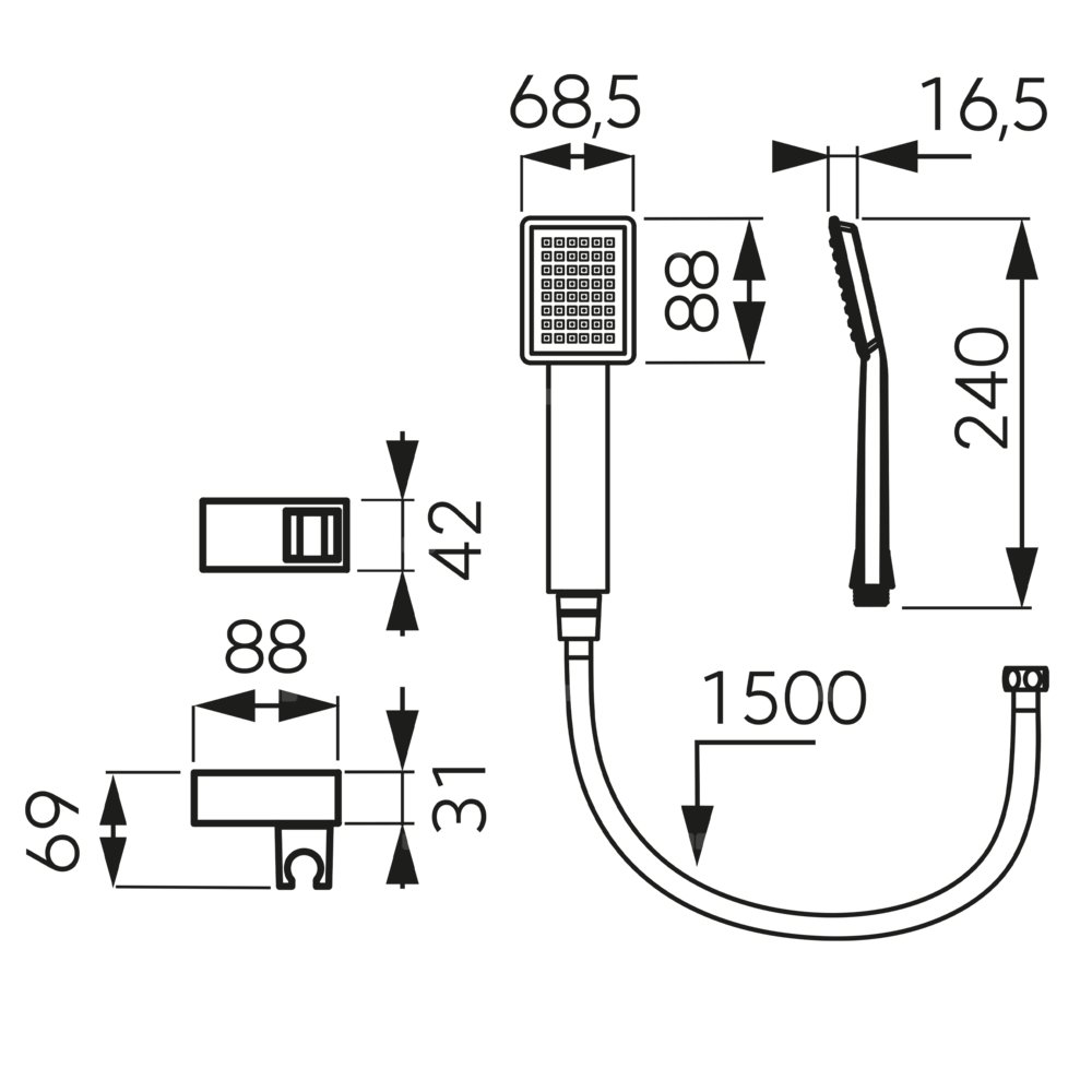 Zestaw składający się z kwadratowej, modnej rączki natryskowej z funkcją strumienia typu deszcz, dobranego stylistycznie uchwytu z regulacją kąta oraz węża natryskowego. System Easy Clean