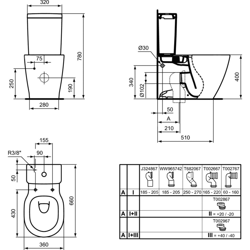 Kompakt WC z systemem spłukiwania w technologii AquaBlade®, zapewniającej najwyższą skuteczność i wyjątkowy design. Miska przylegająca do ściany. Do skompletowania ze zbiornikiem i wolnoopadającą lub zwykłą deską sedesową w wersji typowej lub THIN. Odpływ poziomy - do pionowego należy zamówić kolano przyłączeniowe 90° J324867. Zestaw montażowy TT0257919 w komplecie. Niezbędne wyposażenie: Zbiorniki do kompaktu: CUBE, zbiornik 3/6 l: dopł. wody z dołu E797001 lub dopływ wody z boku E797101/Zbiornik do kompaktu Scandinavian, zbiornik 3/6 l, dopł. wody z dołu E717501/Zbiornik do kompaktu ARC, zbiornik 3/6 l, dopł. wody z dołu E785601/Zbiornik do kompaktu ARC, zbiornik 3/6 l, dopł. wody z boku E786101. Deska sedesowa typu Thin, duroplast E772301/Deska sedesowa typu Thin, duroplast, wolnoopadająca E772401/Deska sedesowa, duroplast E712801/Deska sedesowa, duroplast, wolnoopadająca E712701. Dodatkowe elementy: Element przyłączeniowy 90°: kolano do odpływu pionowego, odległ. 185-205 mm (od ściany do środka odpływu) J324867/kolano do odpływu pionowego, odległ. 185-205 mm WW965742/ kolano do odpływu pionowego, odległ. 250-270 mm T682067/kolano do odpływu pionowego, odległ. 165-220 mm T002667/ kolano do odpływu pionowego, odległ. 60-160 mm T002767. Element montażowy do zastosowania z el. przyłączeniowym T002667 lub T002767, do regulacji odległości +20 /-20 T002867. Element montażowy do zastosowania z el. przyłączeniowym T002667 lub T002767, do regulacji odległości +40 /-40 T002967.