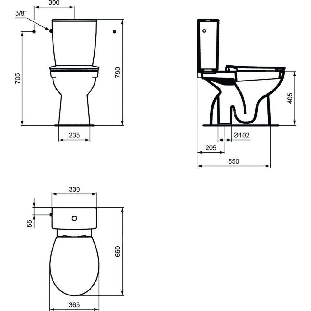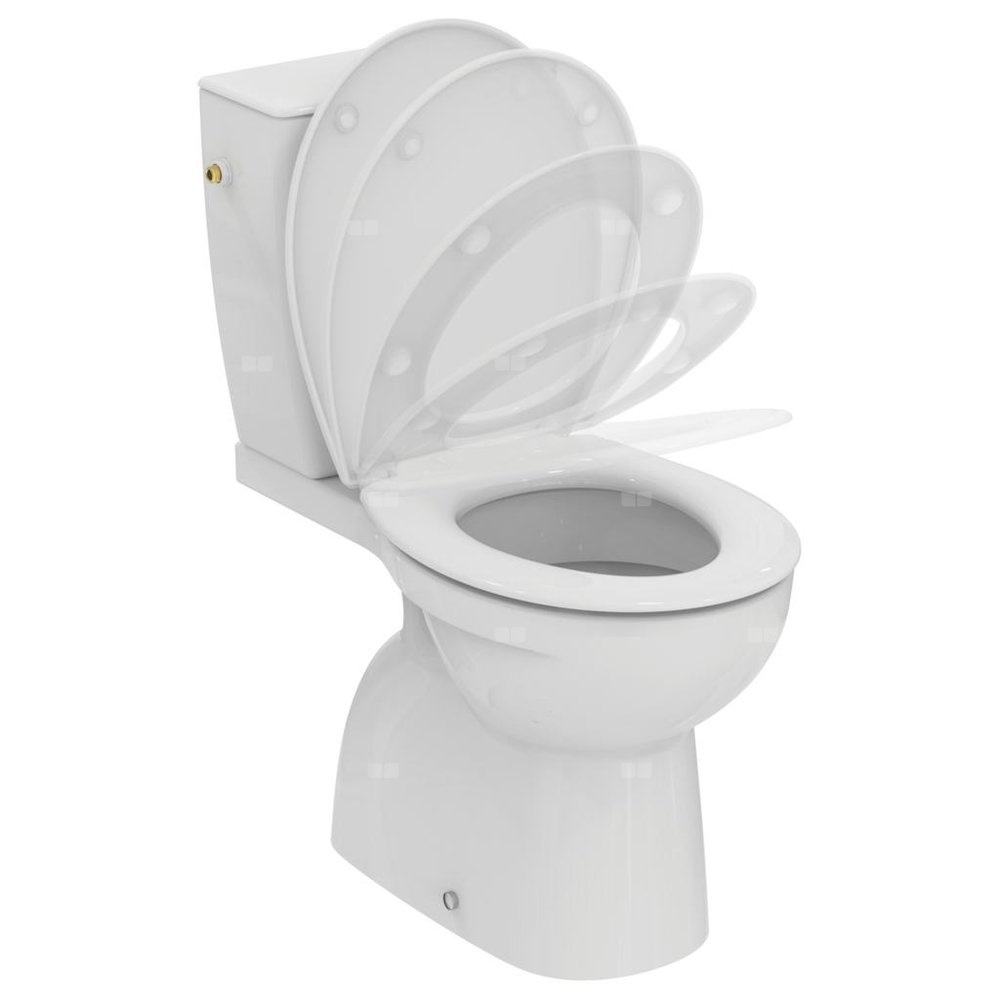 Kompakt WC Eurovit+ ścisle mocowany stojący. Lejowy, z poziomym odpływem pojemność: 4,5/3 l, dwufunkcyjny zbiornik. W komplecie z deską sedesową z duroplastu oraz zestawem montażowym do miski WC.