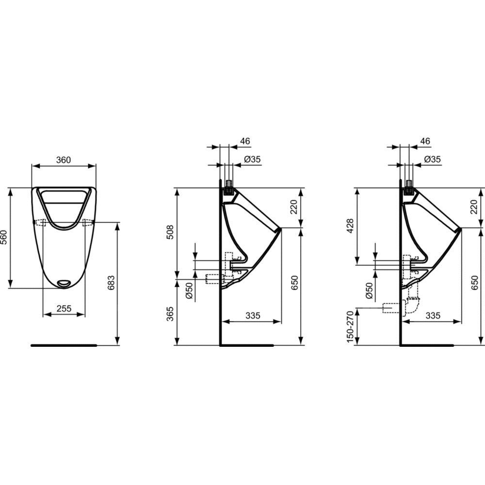 Dopływ wody od góry. Odpływ uniwersalny, do skompletowania z syfonem odpływ poziomy K822367 lub syfonem odpływ pionowy K751501. Zestaw montażowy TT0257919 w komplecie. Zalecane dodatkowe elementy: Zestaw przyłaczeniowy do pisuaru K710667. Syfon - odpływ poziomy K822367. Syfon - odpływ pionowy K751501. Zawór spłukujący do pisuaru - zasilanie od góry, bez zaworu odcinającego B7120AA. Zawór spłukujący do pisuaru - zasilanie od góry, bez zaworu odcinającego B6928AA.