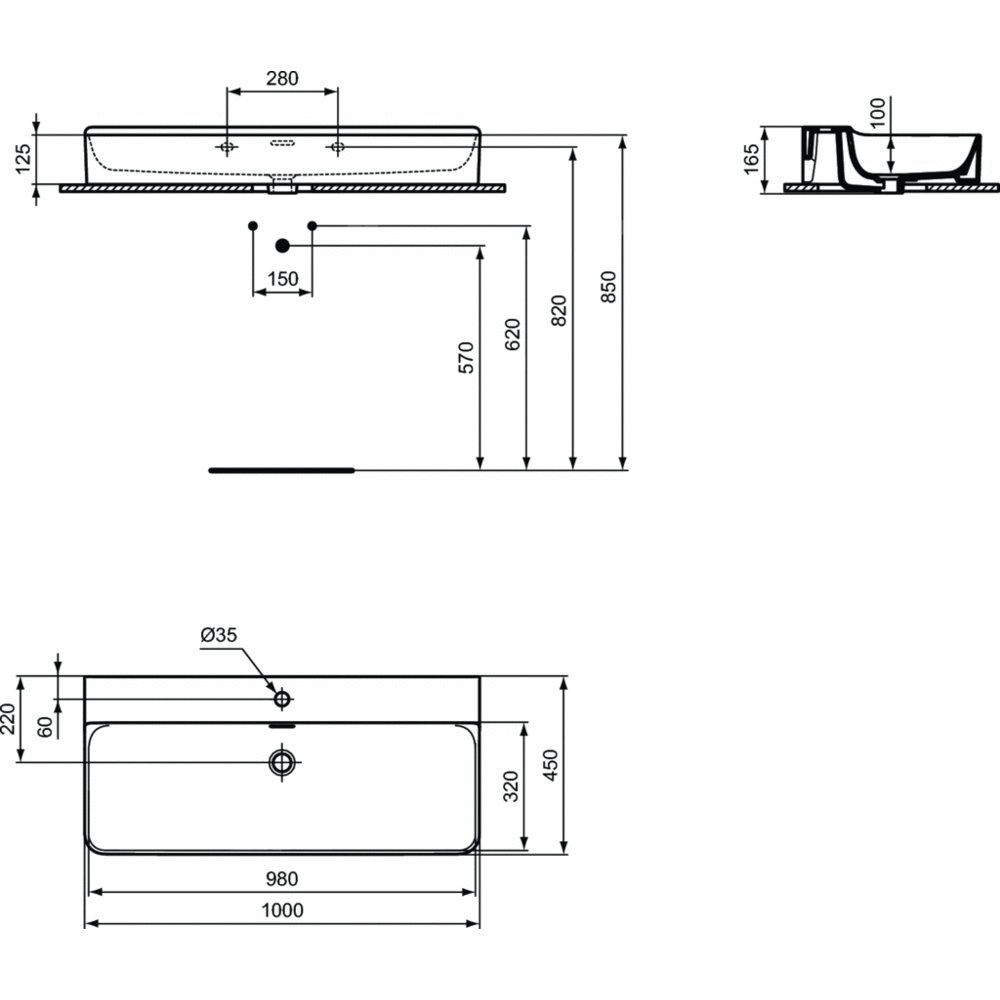Umywalka Conca mocowana do ściany z 1 wybitym otworem na baterię oraz przelewem (kształt szczelinowy).