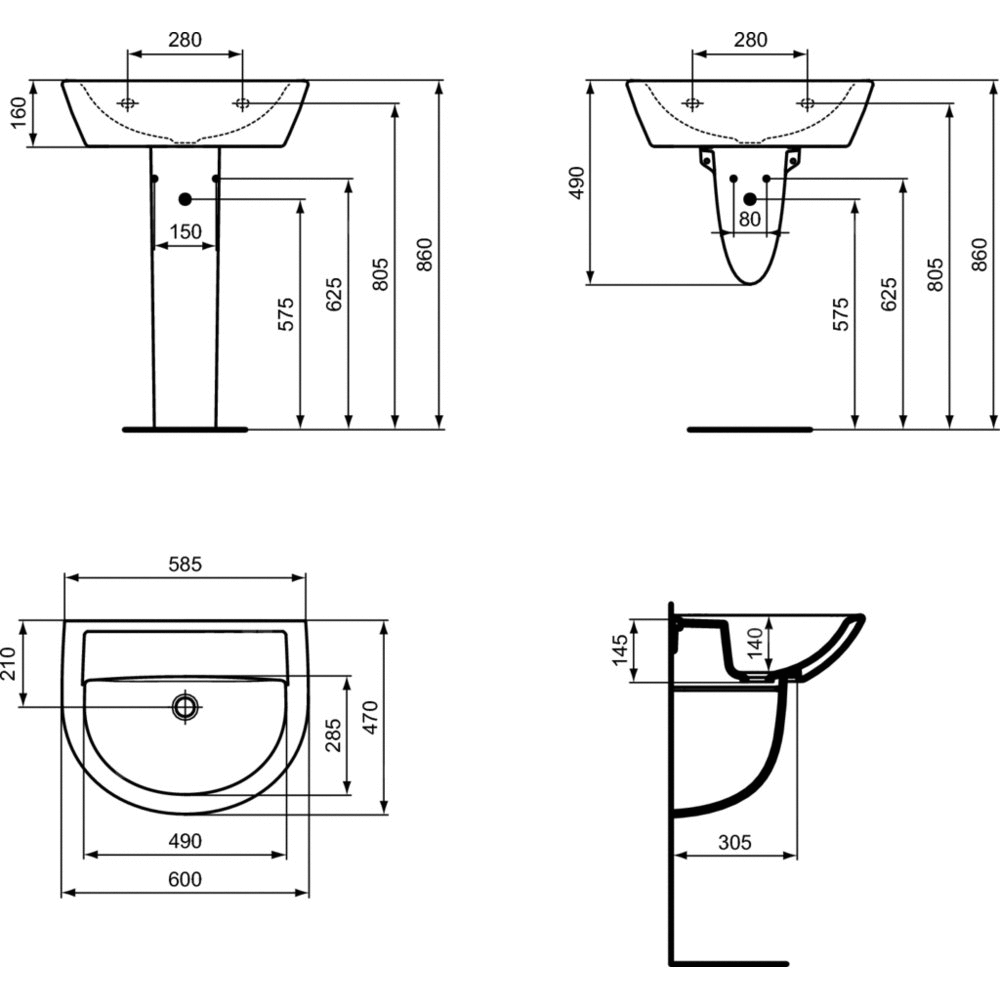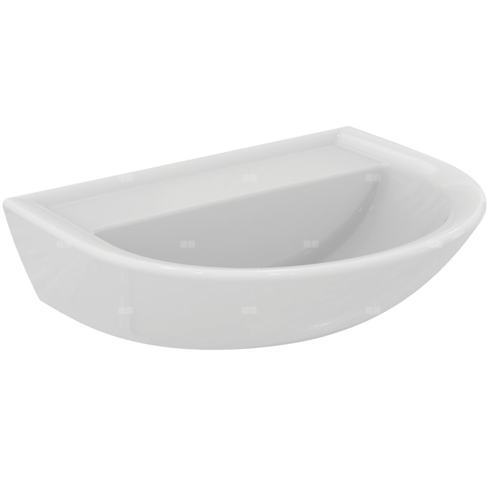 Umywalka Eurovit bez otworu na baterię i bez przelewu. Do montażu z postumentem R2066 lub półpostumentem W3330. Sprawdź listę opcjonanego wyposażenia w katalogu/cenniku.