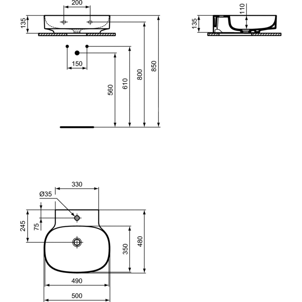 Umywalka Linda-X wisząca do montażu na meblach lub blacie (szlifowany spód). Z wybitym otworem na baterię, bez przelewu. W komplecie szablon do wycinania TT0299731.