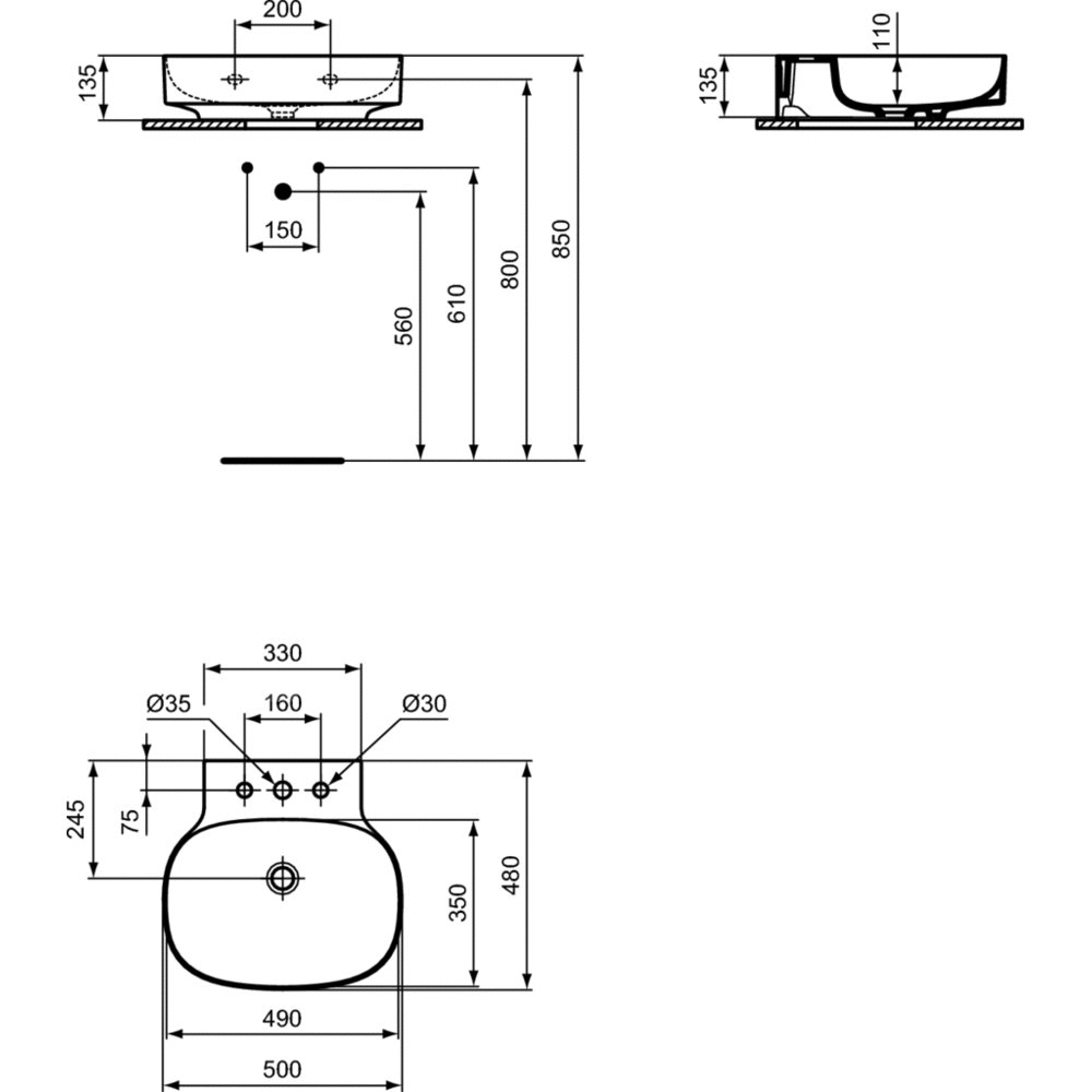 Umywalka Linda-X wisząca, nieszlifowana od spodu, do samodzielnego montażu. Z 3 wybitymi otworami na baterię, bez przelewu. Niezbędny montaż z ukryty system przelewowy IdealFlow N8326AA lub syfon typu free flow E2114xx - w osobnym zamówieniu.